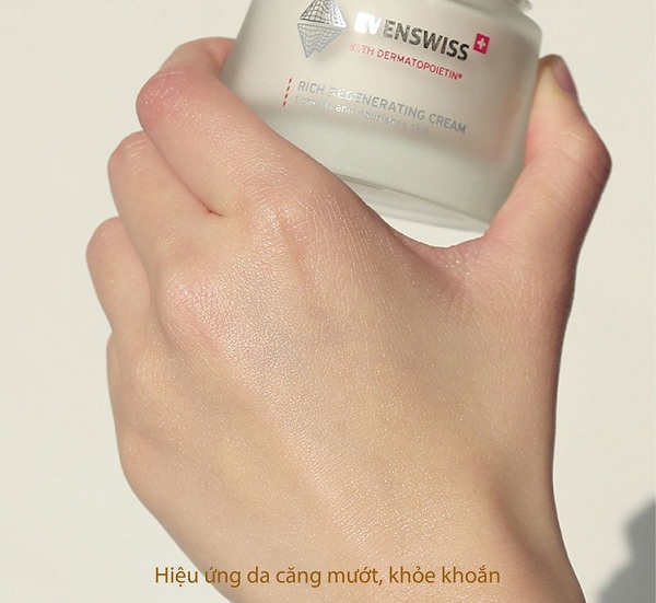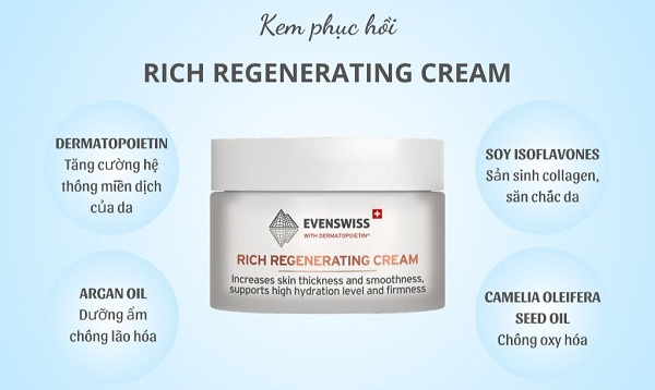 Evenswiss Rich Regenerating Cream sẽ phục hồi tổn thương trên da, tái tạo làn da tươi trẻ, làm săn chắc da, tăng độ bóng khỏe cho da, giảm nếp nhăn, làm dịu da nhạy cảm và ngứa, dưỡng ẩm cho da mềm mại.