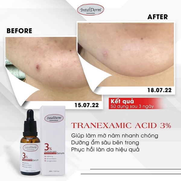 - Serum Intelderm 3% tranexamic acid có hiệu quả phân tán các hắc sắc tố để làm giảm tàn nhang, nám, các vết đốm nâu, đồi mồi,.. trên da. thu nhỏ những vùng da bị nám và giúp da dần sáng, đều màu hơn.