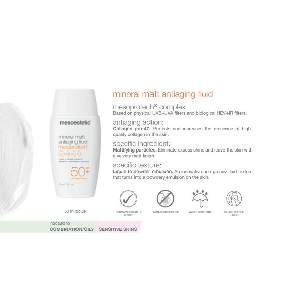 Kem chống nắng Mesoestetic Mesoprotech Mineral Matt Antiaging Fluid SPF50 phù hợp với mọi loai da, đặc biệt da nhạy cảm, da hỗn hợp thiên dầu, da dầu