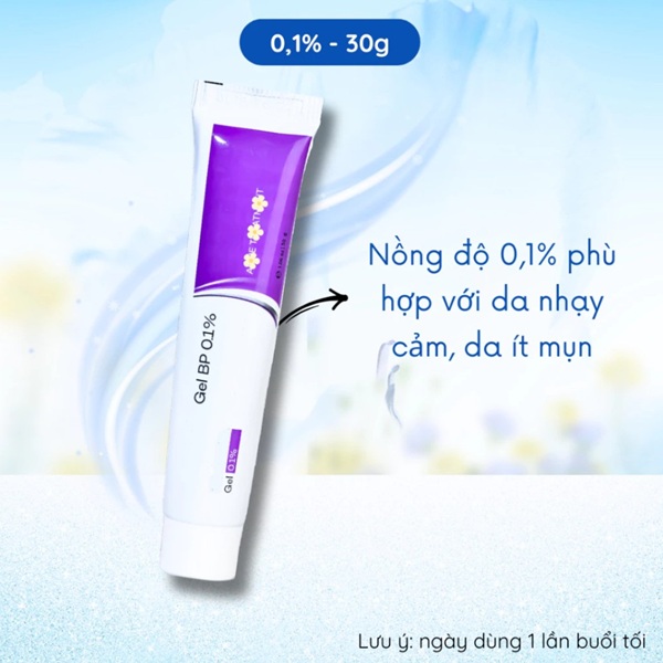 Adapalene 0.1%: hoạt chất chính, có tác dụng kiểm soát sừng hóa, chống viêm và ngăn ngừa hình thành nhân mụn mới.