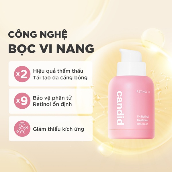 Candid 1.0% Retinol Treatment là tinh chất hỗ trợ tái tạo da với retinol nồng độ 1.0% dạng bọc (encapsulated) – phù hợp cho người đã quen với retinol nồng độ thấp và muốn nâng cấp hiệu quả chống lão hóa. Sản phẩm được nhiều người dùng lựa chọn nhờ khả năng cải thiện bề mặt da, hỗ trợ giảm thâm và hỗ trợ làm mịn lỗ chân lông.